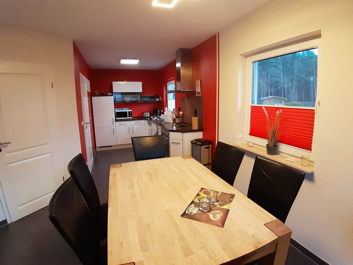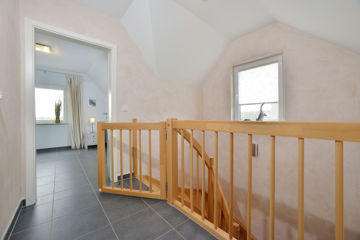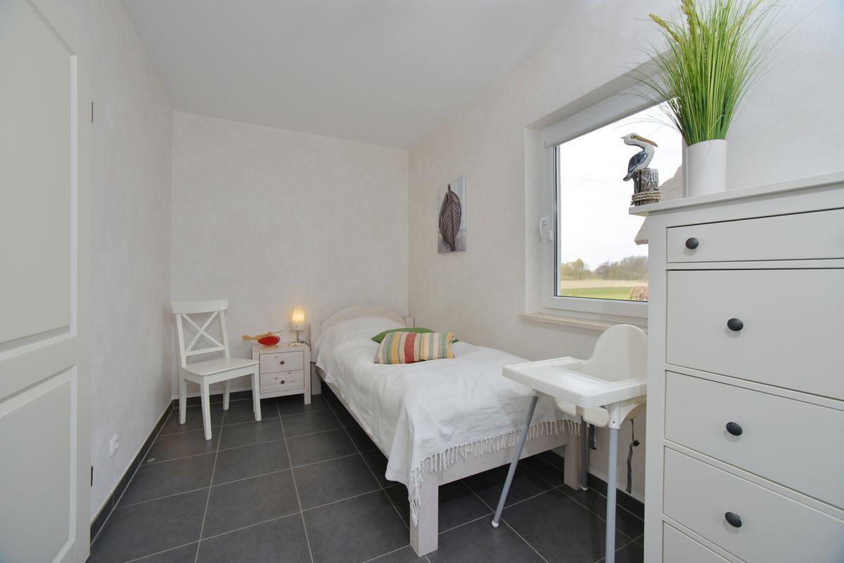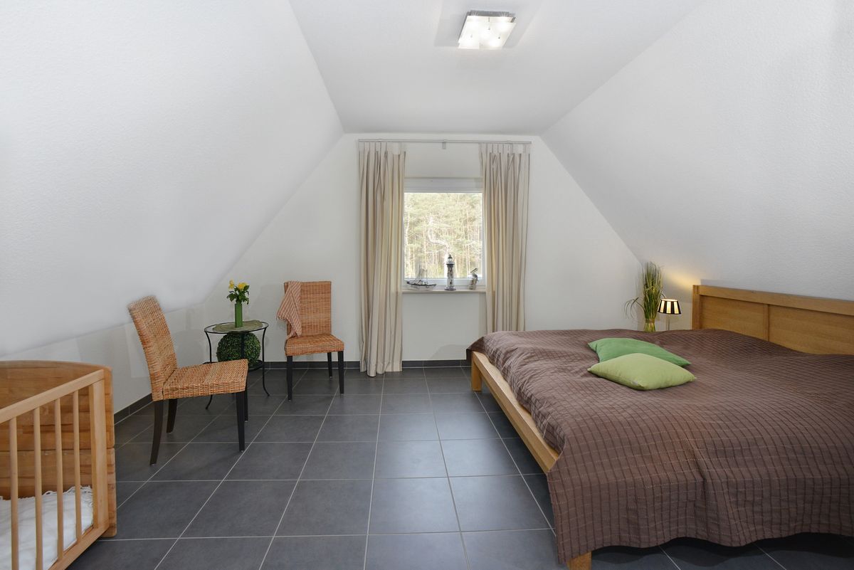 Das Feriendomizil besitzt im Erdgeschoss einen geräumigen Wohn- und Küchenbereich mit Kamin und angeschlossener Terrasse mit Strandkorb und Gartenmöbeln, außerdem ein Badezimmer mit Dusche und ein Schlafzimmer mit einem Einzelbett. In der 1. Etage befindet sich ein Schlafzimmer mit einem Doppelbett und einem Babybett, ein Schlafzimmer mit 2 Einzelbetten sowie ein weiteres Bad mit Dusche und Waschmaschine.