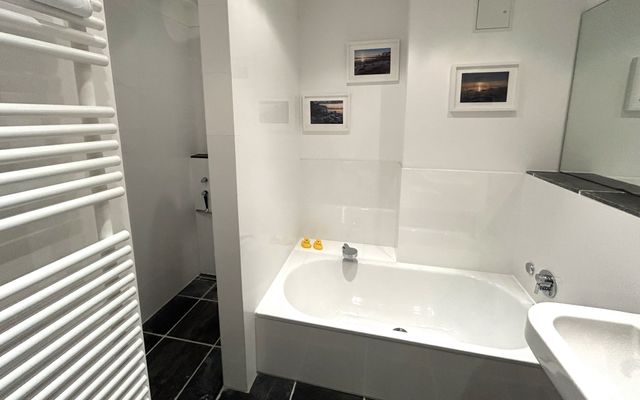 Das "Refugium" befindet sich direkt an der Strandpromenade in Sassnitz. Die Ostsee ist tatsächlich nur ein paar Meter entfernt. Die Nähe zum Meer lässt sich auf dem großen Balkon oder auch von der Couch mit Ostseeblick genießen. Die Einrichtung ist charmant und farbenfroh. Die Wohnung besitzt ein offenes Schlafzimmer mit einem großen Doppelbett. Ein innen liegendes weiteres Schlafzimmer bietet eine Schlafcouch. Es stehen zwei Bäder und außerdem eine Sauna zur Verfügung. Die in den Wohnbereich integrierte Küche hat alle erforderlichen Annehmlichkeiten. Ein Parkplatz steht in ca. 100m Entfernung kostenfrei zur Verfügung.