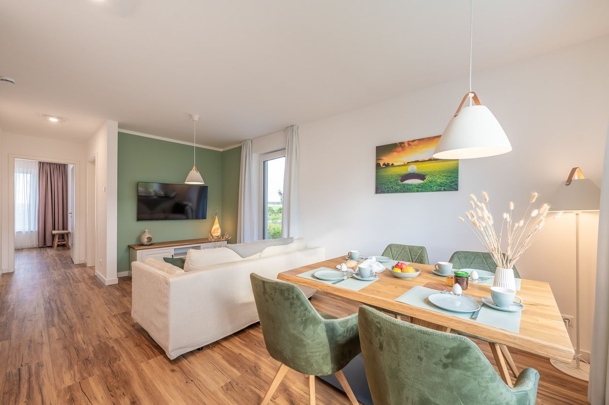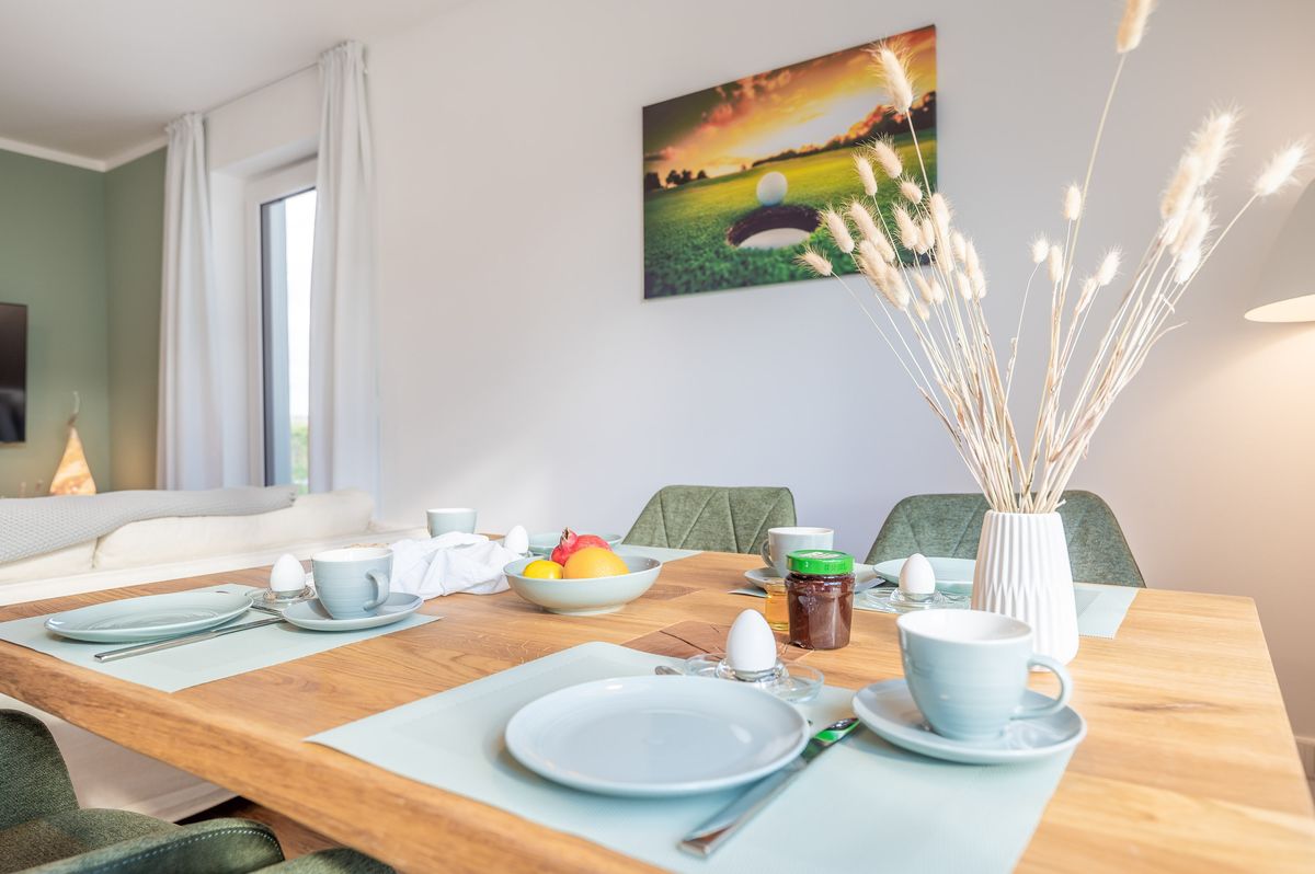 Natur, Ruhe, Komfort und Wellness – das erwartet Sie in dieser wundervollen und lichtdurchfluteten Ferienwohnung mit einer großen Terrasse, von der Sie eine ungestörte Aussicht über den Golfplatz bis zum Wald an der Steilküste genießen. Ideal für 2 Personen ist ihre Ferienwohnung gänzlich ebenerdig und barrierefrei. Ihr geliebter Hund ist ebenfalls willkommen. Golfer werden die unmittelbare Lage am Golfplatz Schloss Ranzow zu schätzen wissen, Naturliebhaber die vielen Wanderwege in den wild-romantischen Buchenwäldern des Nationalparks, die direkt ab der Haustür per pedes oder dem Fahrrad erkundet werden können. Innere Ruhe finden Sie im Wellness-Bad mit ebenerdiger Dusche und elegant freistehender Badewanne, ideal für ein romantisches Badevergnügen zu zweit. Entspannung pur, ohne die Wohnung verlassen zu müssen. Schlafen Sie nach ereignisreichen Tagen im wohlig-eleganten Schlafzimmer auf 7-Zonen Komfortmatratzen. Die Ferienwohnung ist hochwertig ausgestattet mit stilvollem Mobiliar, Smart-TV im Wohnzimmer und komplett eingerichteter Markenküche. W-LAN ist vorhanden. Ein überdachter Parkplatz steht Ihnen direkt am Haus zur kostenfreien Nutzung zur Verfügung.
