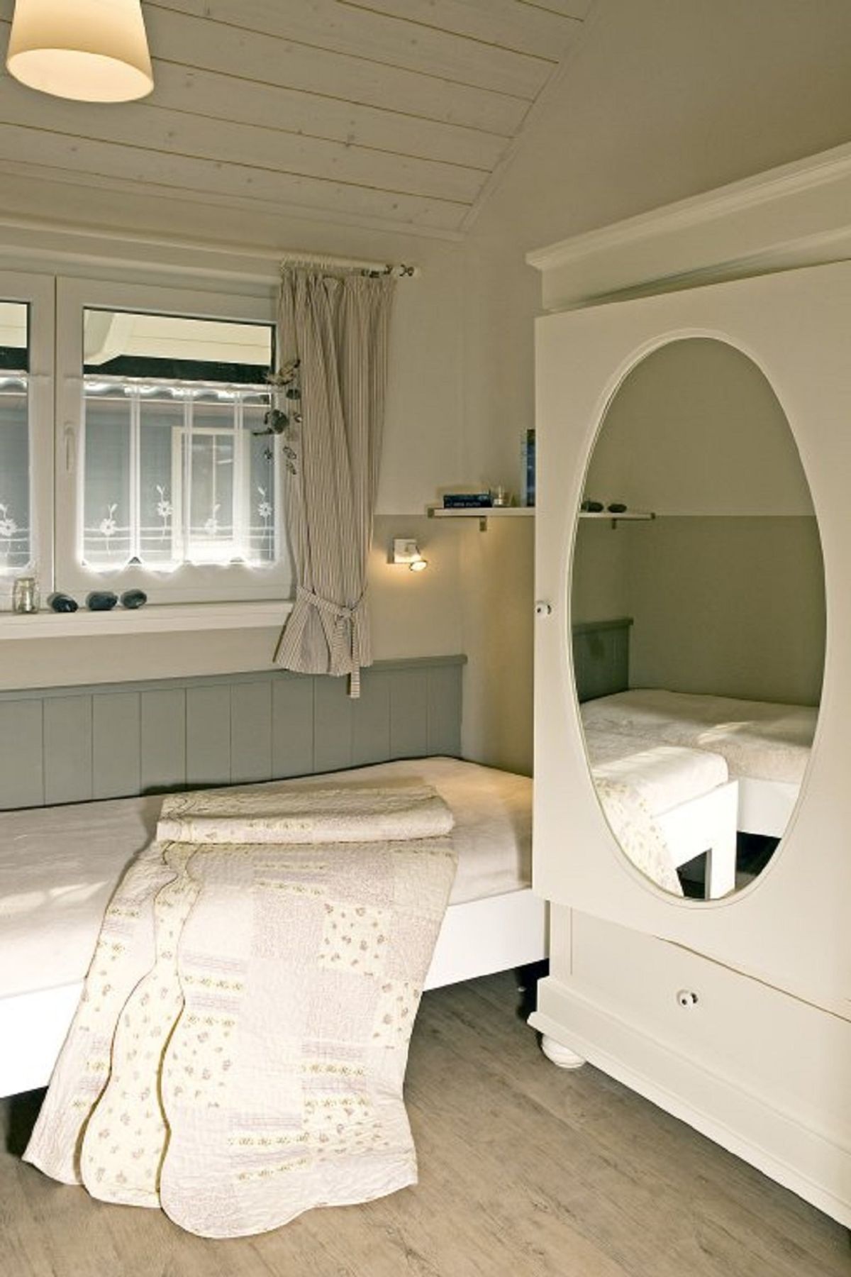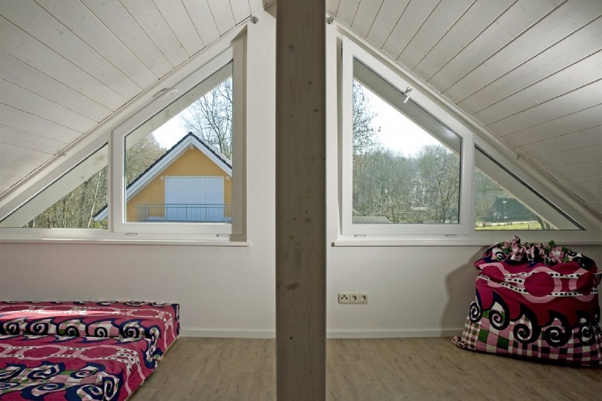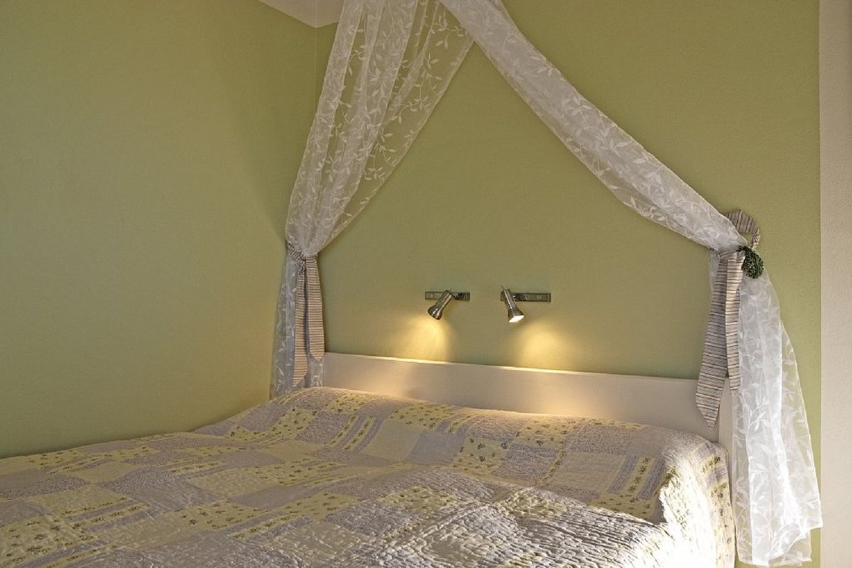 • 4 Schlafzimmer (1. SZ Doppelbett 1,80m x 2,00m, Babybett mögl.; 2. SZ Himmelbett 1,60m x 2,00m3. SZ zwei Einzelbetten 90cm breit; 4. SZ Einbaubett über Raumbreite (2,00m) mit herrlichem Boddenblick direkt aus dem Bett!; Schlafboden mit TV, erreichbar über steile Treppe)