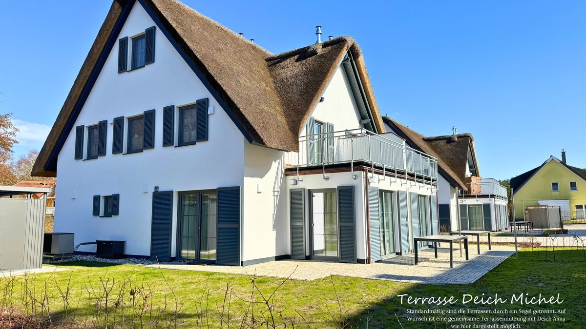 Unser Ferienhaus "Deich Michel" ist nigelnagelneu und mit allem ausgestattet, was das Herz begehrt. In 4 Schlafzimmern finden bis zu 8 Personen ein Plätzchen. 3 Bäder auf 3 Etagen garantieren, dass sowohl mehrere Paare, als auch große Familien mit mehreren Generation den gemeinsamen Urlaub und Privatsphäre genießen können. Im barrierefreien EG befindet sich ein Schlafzimmer mit einem 140cm x 200cm großem Bett und angrenzendem Bad mit Dusche. Im 1. OG haben 2 Schlafzimmer mit jeweils einem Doppelbett (180 cm x 200 cm) Zugang zu einem großzügigen Wellnessbad mit Sauna und Dusche. Eines der Schlafzimmer hat einen direkten Zugang zu einer großzügigen Dachterrasse, von der man auf den Leuchtturm, den Bodden und ins angrenzende Grün blickt - ideal für eine kurze Auszeit oder die Ruhephase zwischen den Saunagängen. Ein Schreibtisch sowie gemütliche Sitzmöglichkeiten im 1. OG bieten die Möglichkeit, sich zurückzuziehen - zum Arbeiten oder für eine Auszeit.