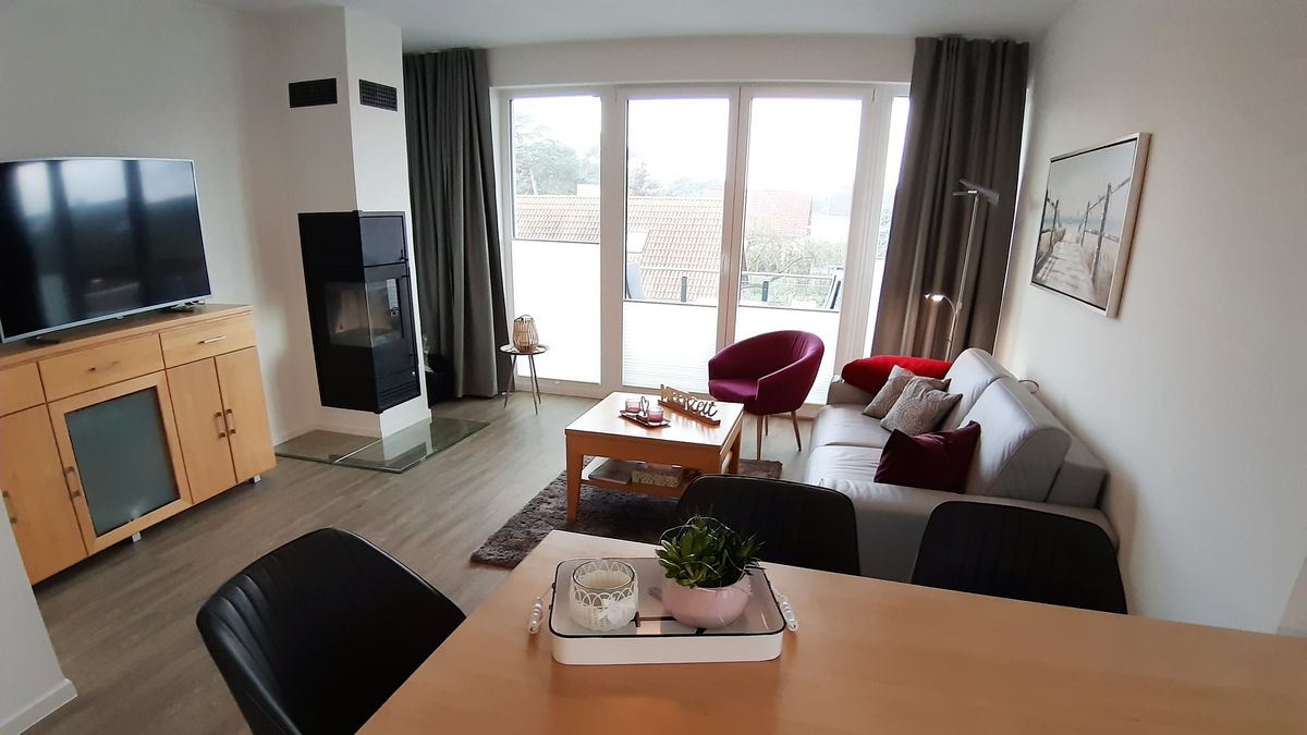 Die Wohnung "Riecht nach Meer" besitzt 2 Schlafzimmer, ein Bad mit Dusche, ein Gäste-WC und einen Wohnbereich mit Essbereich, Kamin und integrierter Küche, außerdem einen Balkon und eine riesige Dachterrasse mit Strandkorb. Zur Wohnung gehört ein Tiefgaragenstellplatz. Im Gebäude steht Ihnen eine Gemeinschaftssauna (kostenfrei) sowie ein Waschsalon (kostenpflichtig) mit Waschmaschine und Trockner zur Verfügung. Ihre Drahtesel parken Sie im abschließbaren Fahrradraum. Unsere Minis vergnügen sich auf einem kleinen Spielplatz. Das Beste aber ist die Nähe zum Ostseestrand!