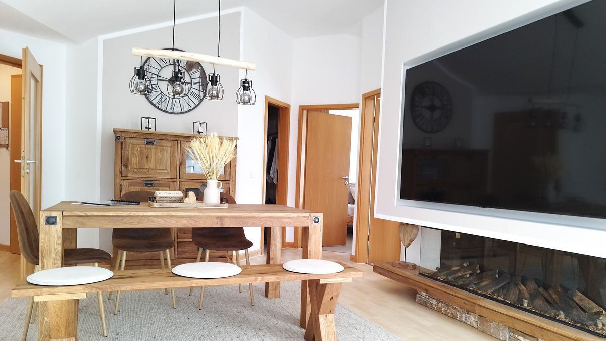 Der großzügige Wohnbereich mit angrenzender Terrasse lädt mit großer Sitzgruppe, Kamin und TV sowie komfortabler Küche zum Verweilen ein. Es sind zwei Bäder mit Dusche vorhanden.