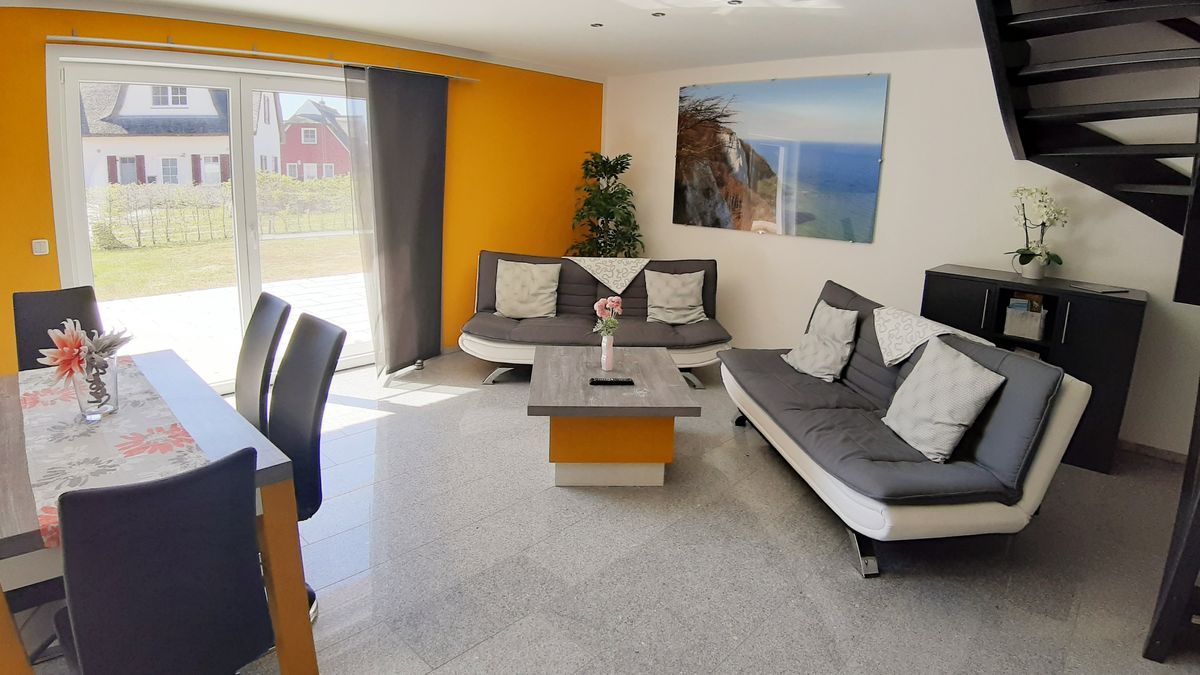 Das idyllisch gelegene Reihenhaus "Wittow" in Breege bietet den idealen Rahmen für entspannte Urlaubstage im Norden der Insel Rügen. Umgeben von ruhigen Wegen und der charakteristischen Boddenlandschaft entsteht ein harmonisches Zusammenspiel aus Natur, Komfort und moderner Wohnqualität. Der helle Wohnbereich öffnet sich direkt zur Terrasse und schafft eine freundliche Atmosphäre, die sich wunderbar ins Freie verlängert – perfekt für ein Frühstück in der Morgensonne oder ruhige Momente an der frischen Luft. Die bestens ausgestattete Küche ermöglicht das mühelose Zubereiten gemeinsamer Mahlzeiten. Zwei einladende Schlafzimmer – eines mit Doppelbett, eines mit zwei Einzelbetten – sorgen für erholsame Nächte und bieten ausreichend Platz für bis zu vier Personen. Das neu modern gestaltete Badezimmer überzeugt mit einer komfortablen, ebenerdigen Dusche und einem klaren, zeitgemäßen Design. Ein zusätzliches Gäste-WC ergänzt die Ausstattung. Ein Parkplatz direkt am Haus erleichtert den Aufenthalt und sorgt für Bequemlichkeit während des gesamten Aufenthalts. Das Reihenhaus "Wittow" vereint ruhige Lage, moderne Ausstattung und ein angenehmes Wohnambiente – ein Ort, an dem entspannte Tage und echte Inselmomente entstehen.